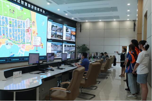 “创新驱动发展,科技引领未来”,互联网+旅游新态势稳步发展,山海天旅游度假区秉承着这个理念,推动该地旅游业蓬勃发展。日照山海天旅游度假区智慧旅游指挥平台整合了社会综治“雪亮工程”,公安“天网系统”,交警道路监控,旅游景区监控,大项目建设系统等七大视频监控系统,对全区社会面和道路、景点、民俗村实时监管。在工作人员带领下,实践队员亲身体验智慧旅游指挥平台,感受到科技与旅游融为一体为旅游行业带来的巨大红利,感受到科技创新带来的进步,明白奋斗创新的无限可能性。