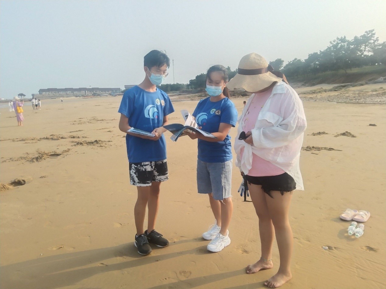 迎着拂面的海风,海水的气息扑面而来,小海螺曲阜师范大学青春服务队成员来到美丽的滨海景区—山海天阳光海滩景区。在炎热的夏日,志愿者们不畏高温,不辞辛劳,身穿蓝色小海螺队服,在海滩上向市民和游客进行细致耐心的文明旅游宣传,并发放旅游地图、旅游折页,提醒来此处游玩的游客提前了解疫情防控规定,遵守景区“预约、错峰、限流”措施,遵守旅游活动中的疫情防护要求和文明旅游规定,不随手乱扔垃圾,爱护生态环境,积极营造文明有序的旅游环境。针对游客们提出的问题,志愿者黄一凡对其进行耐心细致的解答,并热情的介绍日照的著名景点,外地游客连连称谢。志愿者们积极为市民和游客提供问询服务,展示了文明有礼的志愿服务青年形象,赢得了游客的赞赏。“来到美丽的海滩,整个人心情都很放松,也会想要主动爱护生态环境,维护这里的碧海蓝天。”,游客王女士说。在宣传文明出游理念的过程中,志愿服务者们明显感受到,随着“绿水青山就是金山银山”理念的普及,人民群众保护自然环境的意识明显加强,构建人与自然和谐共生观念成效显著。