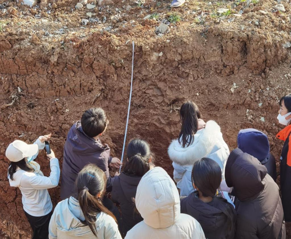12日,经过三小时车程,赶赴平邑县天宇自然博物馆。在工作人员的精心讲解下,同学们系统了解了矿物学、古生物学以及区域地质背景。走进天宇的矿物标本展厅,凝结了地球亿万年灵气的矿物晶体让同学们感叹大自然的神奇魅力。来自乌拉圭、巴西的水晶,巴基斯坦的海蓝宝石,哥伦比亚的祖母绿,印度的鱼眼石……四百余种,数万件罕见的矿物宝石标本,集天地精华于一体,流光溢彩,令同学们叹为观止。化石馆拥有世界上馆藏最长的硅化木以及世界上最大的中华龙鸟化石,小到肉眼难辨的虫卵,细到叶片的脉络,展示了亿万年来生命演化的的足迹,再一次给同学们带来心灵上的震撼。下午,同学们在临沂市温水镇公利村观察褐土剖面,并进行实地测量,剖面描绘,同时注重与棕壤成土环境的对比。在实习过程中,徐刚、王振海两位老师通过对褐土剖面的讲解,将课堂理论与实习中出现的地理事物充分结合,使同学们体会地理环境的整体性和差异性以及地理要素的关联性。同学们团结协作,以小组为单位进行自由讨论,探索土壤剖面中蕴含的环境信息,加深了同学们对褐土形成过程的理解。