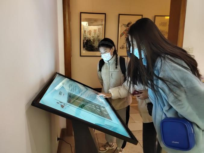 图为“寻迹”小队成员借助显示屏观看展厅作品介绍