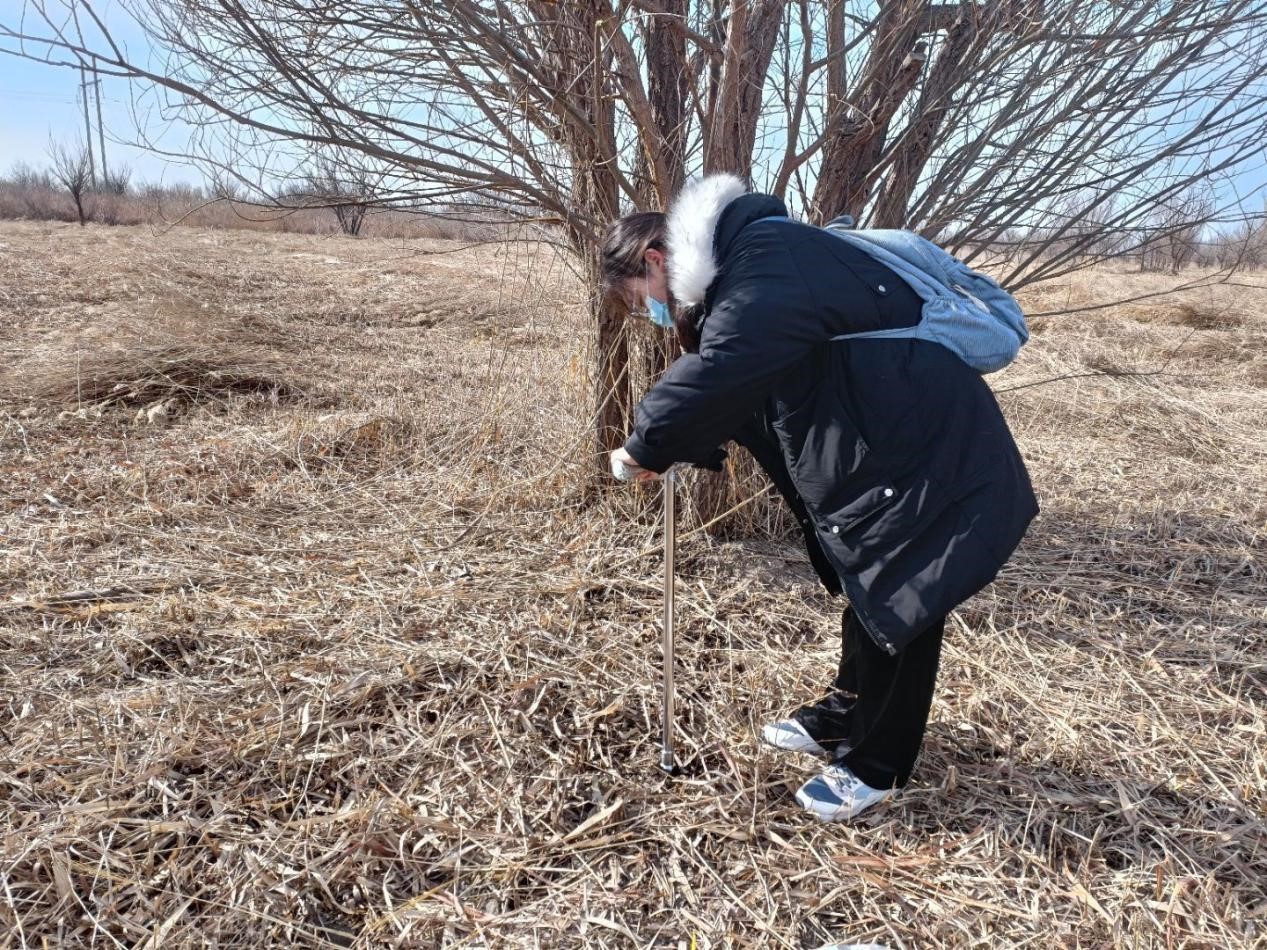为了更加高效率的完成采取任务,队员们分为两组分头进行取水和取土的相关工作。分队一沿河边对土壤进行选取,并利用取土器进行取土。取土器上有明显的刻度标识,方便确定取土深度,利于样本的纵向比对,便于实验数据的分析与研究。可以清楚的观测到,埋在湿杂草底下的表层土壤被露水浸润,变得湿润而富有黏性。这也有利于取土器的深度插入与采取。据当地人民介绍,因黄河携带大批泥沙入海,被海水浸渍成为盐渍泥土,不停堆积,最终海退成陆,在蒸发作用下盐分齐集于地表,因此当地土壤表层含盐量远大于深层土壤。