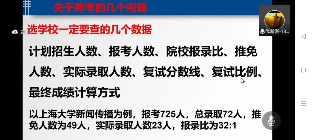 各位主讲人根据实际情况与自身经验对同学们进行了精彩的讲述。姜凯针对考研考试准备为同学们进行了细致的讲述,他根据自己的实际备考经验总结了每一科该怎样高效学习,让同学们对考研该如何准备有大致了解;武新淇系统地向同学们介绍了跨考的相关问题。他指出首先要考虑的问题是什么样的人适合跨考、该如何选择跨考学校、跨考专业等;袁琳则从备考时间线、复习攻略方面作出了分享,强调备考过程一定要保持良好的心态,提高学习效率,注重复习质量;储文沁则向大家分享了她的择校择专业经历,考研也是信息赛,一定要注重多方收集信息,多向外界人士请教。
