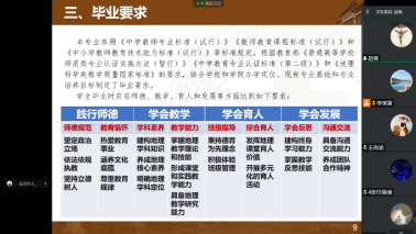 报告会第二阶段,赵爽从专业简介、培养目标、毕业要求、学制学分、主要实践教学环节、学分分配等方面详细解读了地理科学专业人才培养方案。赵老师基于师范专业认证理念,分析了培养目标、毕业要求和课程目标之间的逻辑关系,并告诫学生只有认真学好每一门课,完成各项课程目标,才能达成毕业要求,并在毕业五年后实现培养目标。