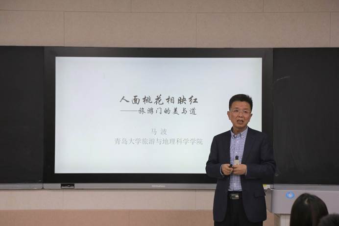 特邀青岛大学马波教授担任旅游管理专业的主讲人。马波教授以崔护的《题都城南庄》开讲,巧妙的将诗句“人面桃花相映红”与旅游管理专业联系起来,从旅游学科的“美”与“道”两个方面深刻诠释了旅游管理专业的学科特征与学习研究的方法。