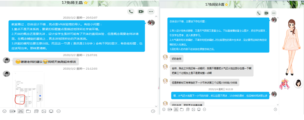 有了前期师生线上交流及教学基本功训练的基础,李老师和学生们在新学期线上模拟实习就比较驾轻就熟,配合无虞。针对模拟实习教学,充分利用现有的即时交流软件、直播平台和办公软件,综合运用文字、语音和视频等互联网即时交流手段,尽量做到在线如在课堂,连线既是对面,以获得不亚于教室课堂的效果。