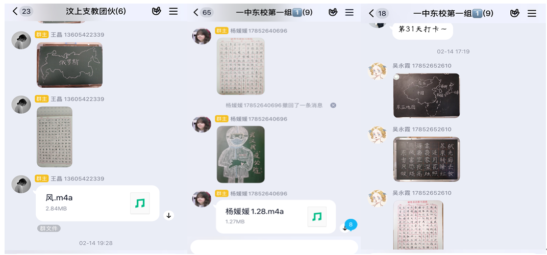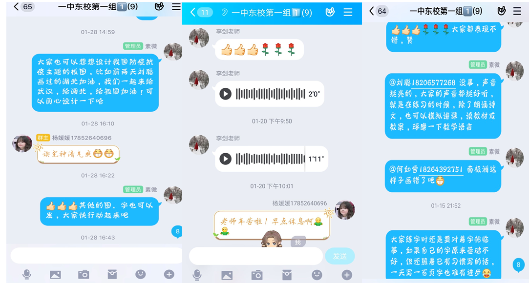 假期里学生每天进行朗读、板书、板图和钢笔字练习,并且在QQ群打卡,李剑老师会针对学生练习情况提出指导建议。从放假的第一天,到新学期开始模拟实习的前一天,每个学生都坚持打卡了40天。李老师会择优在自己的QQ空间、微信朋友圈公开发布,这对同学们也是一种激励。期间,武汉乃至全国发生了大规模的新冠病毒感染疫情,李老师又配合幸运飞艇开奖